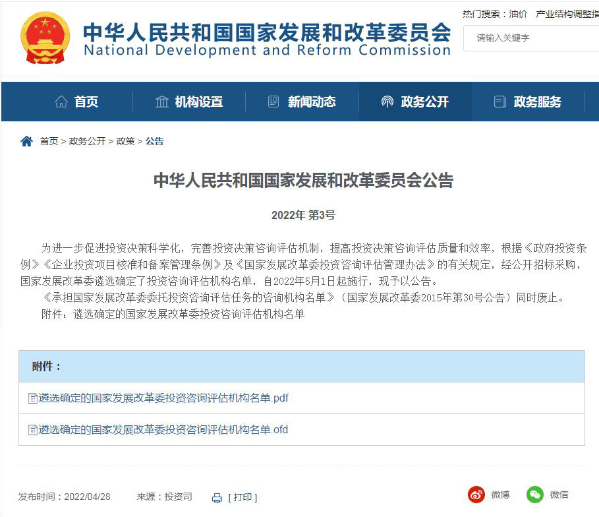 近日,国家发展和改革委员会(以下简称发改委)公布了遴选确定的投资咨询评估机构名单(以下称短名单),中核工程成功入选核电专业。本次遴选确定的全国仅有37家承担发改委咨询评估任务的机构,较2015年短名单调整了15家单位。其中核电专业入选企业仅3家,中核工程更是核工业行业唯一入选的企业,另外入选的两家企业分别是中国国际工程咨询有限公司和电力规划总院有限公司。