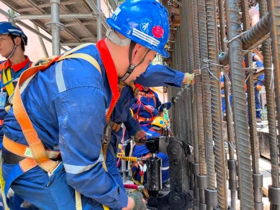 为顺利完成吊装,漳州核电项目部采用了新的连接工艺——挤压锥套连接确保连接可靠,控制模块精度、定制加固工装、多次反复验算整体稳定性,既破除了传统钢筋现场施工作业面受限、材料运转困难的难题,又解决了模块整体稳定性难控制、施工难度大的问题,保证了吊装全过程安全可控。
