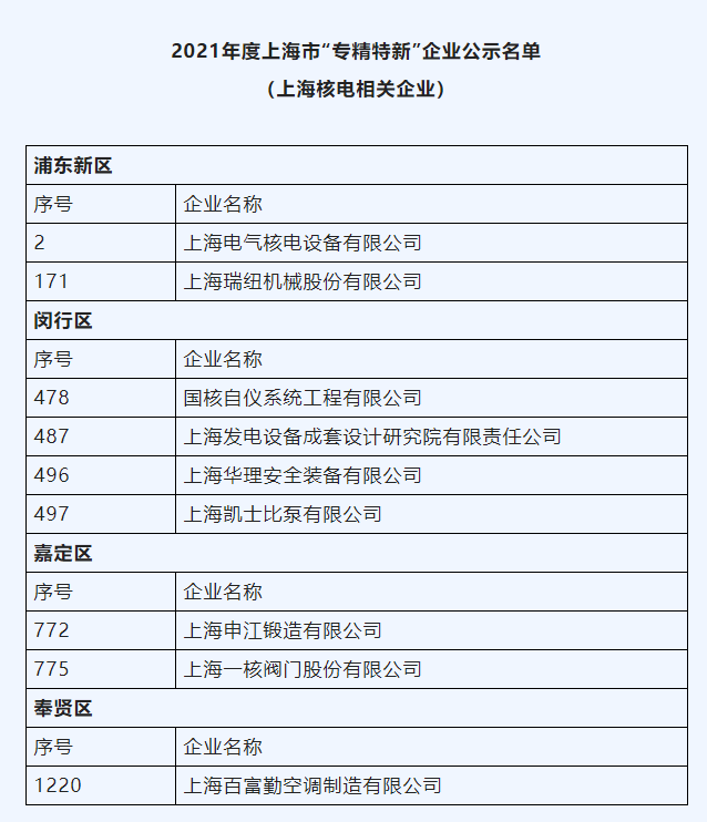 5月19日,上海市经济和信息化委员会公布《2021年度上海市“专精特新”企业公示名单》,共有 1430家企业列入公示名单。其中,有9家为核电相关企业,分别是:上海电气核电设备有限公司、上海瑞纽机械股份有限公司、国核自仪系统工程有限公司、上海发电设备成套设计研究院有限责任公司、上海华理安全装备有限公司、上海凯士比泵有限公司、上海申江锻造有限公司、上海一核阀门股份有限公司、上海百富勤空调制造有限公司。