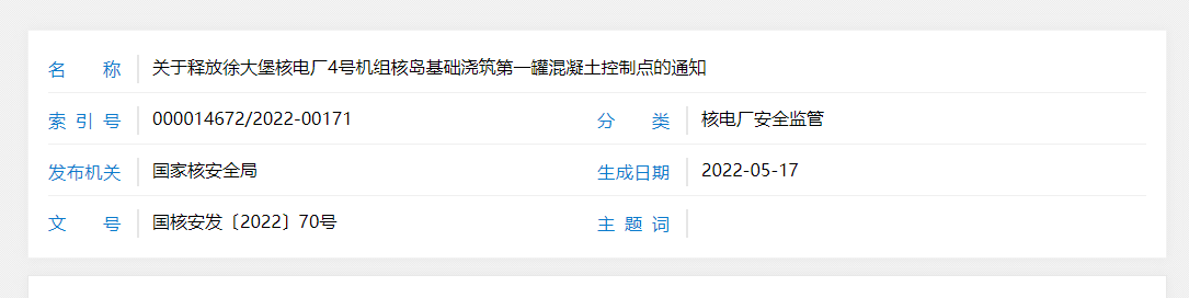 关于释放徐大堡核电厂4号机组核岛基础浇筑第一罐混凝土控制点的通知