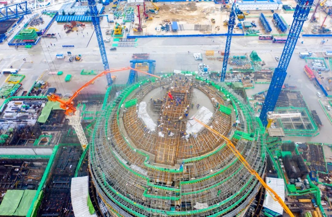 传承创新添动力。依托福清华龙世界首堆经验,实施项目总结复盘和经验反馈,持续优化施工逻辑,将原设计图纸中的施工总层数17层优化为10层,并对穹顶9和10两层合并浇筑,减少了8层施工缝,为节点完成极大地争取了时间。