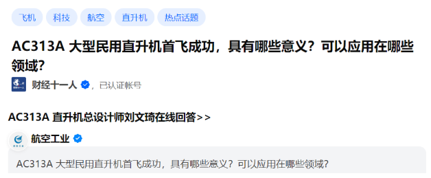 从2017年启动在AC313基础上升级研制到如今首飞成功,近五年的时间里,型号进行了翻天覆地的改进,实际上是重新研制了一款新型直升机。作为直升机科研工作者,面向国家需求,打造高品质、高任务能力的民用直升机,我们矢志不渝,责无旁贷。我们也将以AC313A成功首飞为新起点,不忘航空报国初心,全力投入飞行试验以及结构/系统地面试验室试验、适航审查和航空器评审等工作,以饱满的奋斗状态和型号最新的研制成果,助力国家航空应急救援体系建设。