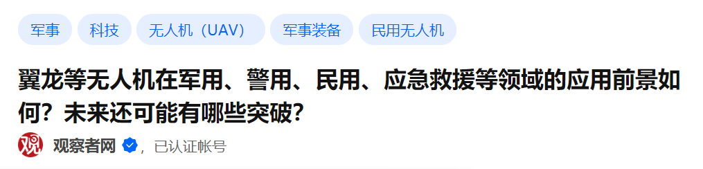 翼龙系列无人机是航空工业研制的大型长航时无人机,用途非常广,也获得了广泛认可。翼龙无人机是在我国航空科技创新成果基础上,例如三代机的总体设计、电传飞控、综合航电等,通过对无人机技术的探索,实现再突破、再创新的成果。
