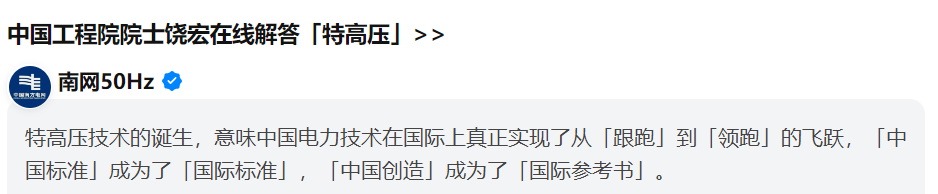 随着研究深入,特大电流下的绝缘特性、电磁环境、设备研制、试验技术等一系列世界级技术难题横亘在我们面前。几年后,我们终于建成了世界上第一个±800千伏特高压直流输电工程——云广特高压直流工程。依托该工程,我们首次掌握了特高压直流工程系统研究和集成核心技术,形成特高压直流工程自主化整体解决方案。特高压技术的诞生,意味着中国电力技术在国际上真正实现了从“跟跑”到“领跑”的飞跃,“中国标准”成为了“国际标准”,“中国创造”成为了“国际参考书”。