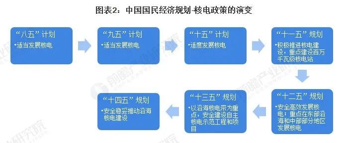 “八五”计划(1991-1995年)至“十五”计划(2001-2005年)时期,国家层面提倡:适当、适度发展核电;从“十一五”规划开始,规划明确了将积极推进核电建设,且重点建设百万千瓦级核电站。随着我国加入WTO,经济突飞猛进,用电需求大增,于是核电再次被重视起来,2007 年我国通过了《核电中长期发展规划》,首次将“适度发展核电”修改为“积极发展核电”,核能发展自此进入快车道。