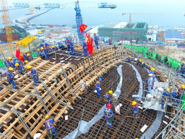 漳州核电1号机组安全壳厂房为双壳结构,主要由筏基、筒体、穹顶三部分组成,其中内层安全壳穹顶为半球形结构,位于筒体+45.130m 以上,混凝土结构形状为半圆球形预应力钢筋混凝土结构,内层为半球形钢衬里壁板,本次浇筑完后顶部标高+70.480m,壁厚1050mm,混凝土总方量约4000方,刷新了漳州核电“新高度”。