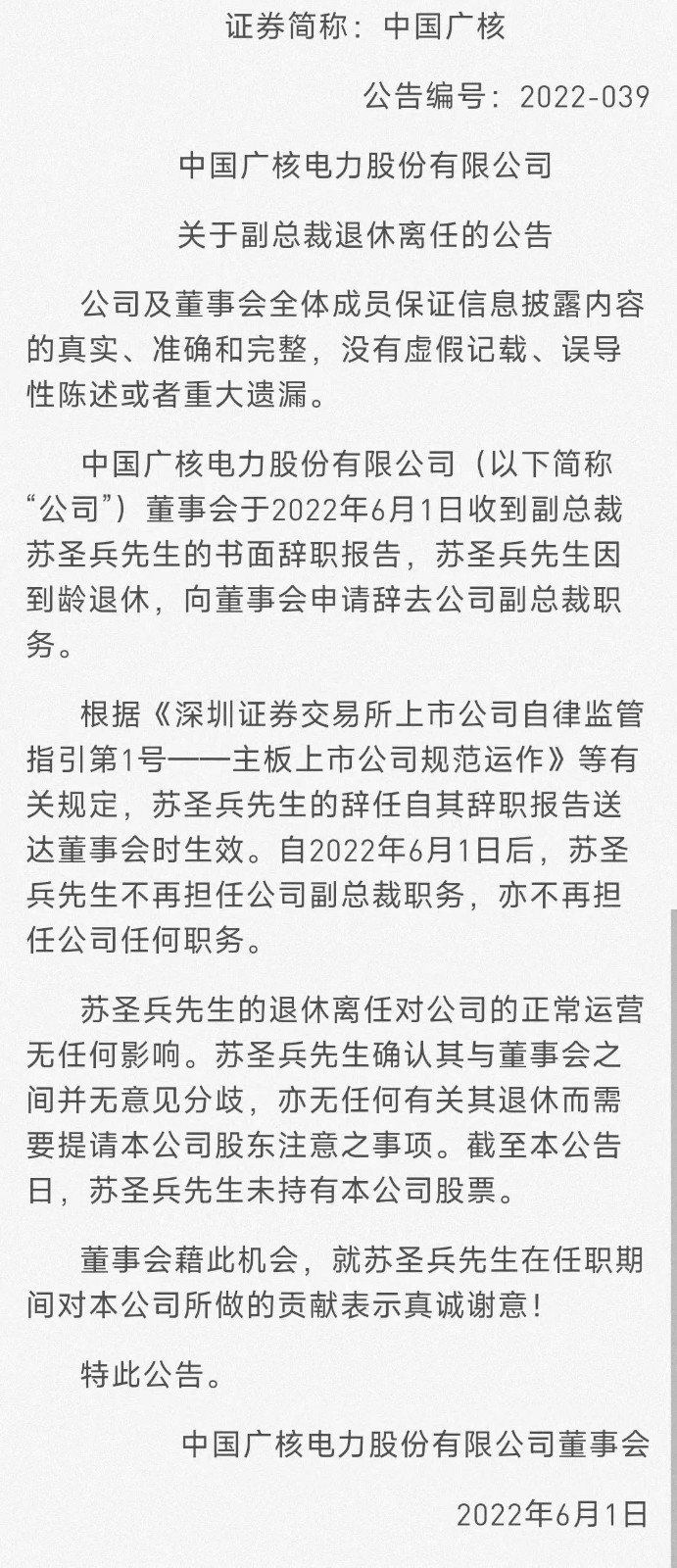 据公开消息显示,2022年6月2日中国广核发布关于副总裁退休离任的公告,中国广核电力股份有限公司(以下简称“公司”)董事会于2022年6月1日收到副总裁苏圣兵先生的书面辞职报告,苏圣兵先生因到龄退休,向董事会申请辞去公司副总裁职务。
