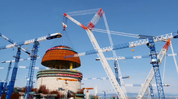 穹顶吊装是核电工程建设的重要节点,也是难度最高的环节之一。“华龙一号”的穹顶为直径46.8米的半球体,高23.4米,穹顶及配套绳索总重超过500吨,如此庞然大物要整体吊装至45米高的核反应堆堆顶上,难度可想而知。