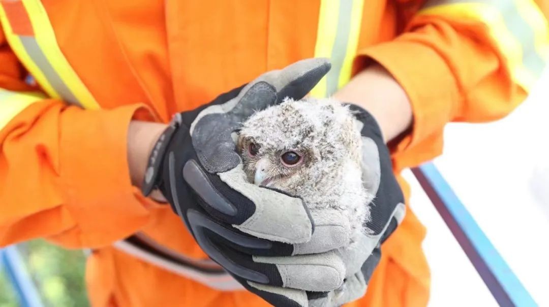 消防员救助三门核电厂区国家二级保护动物猫头鹰雏鸟