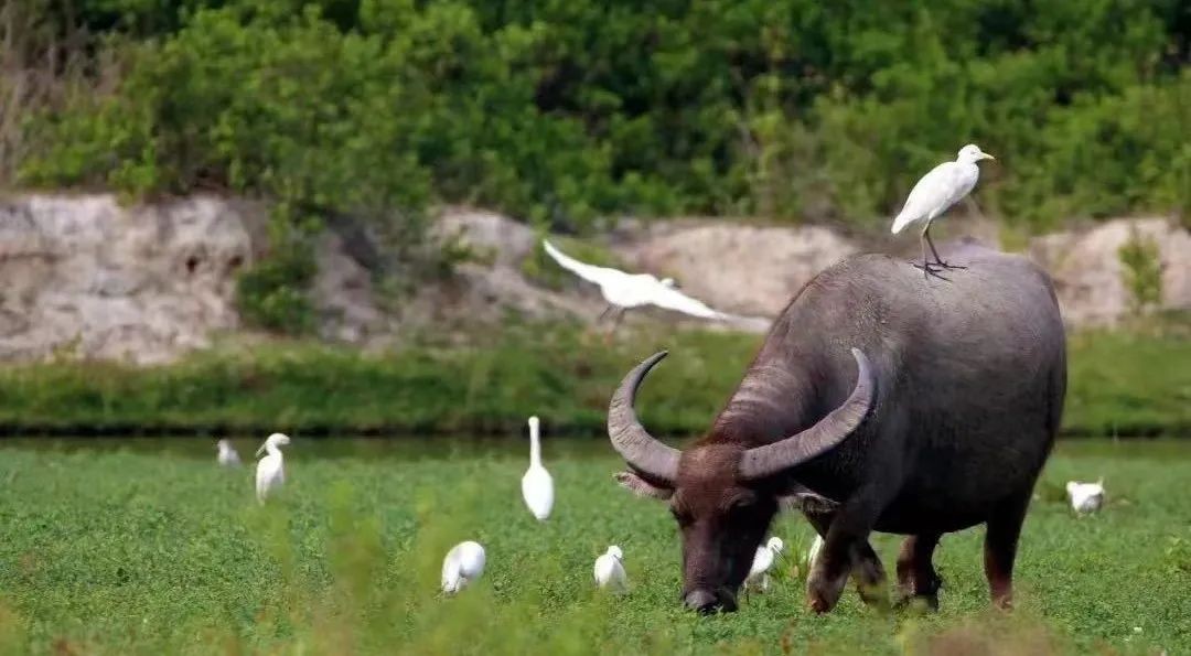 白鹭、水牛在海南核电排洪渠形成的人工湿地上嬉戏