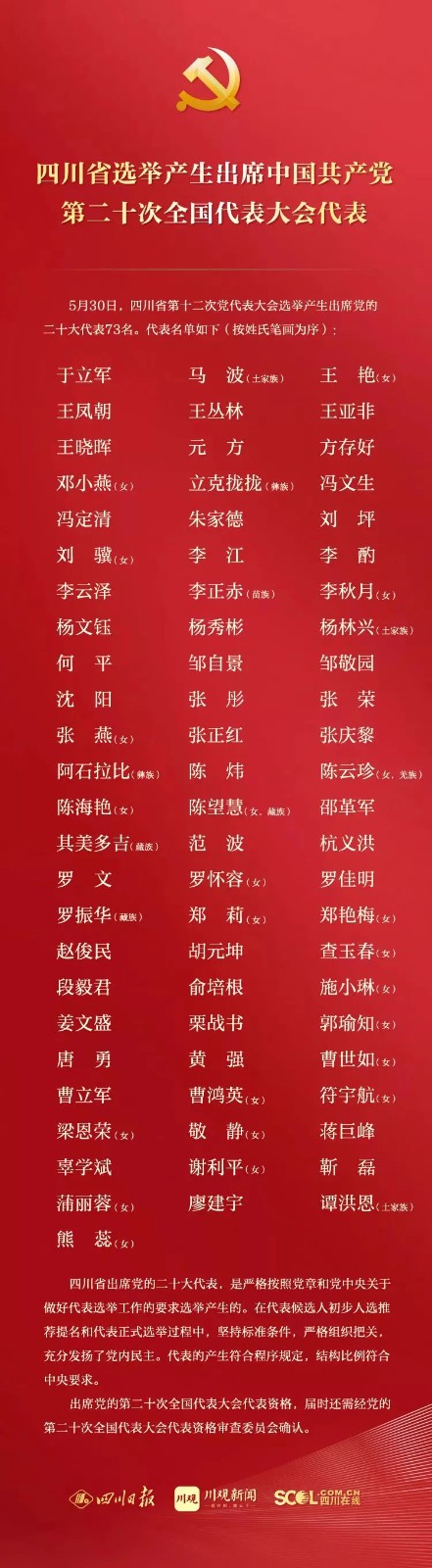 四川省出席党的二十大代表,是严格按照党章和党中央关于做好代表选举工作的要求选举产生的。在代表候选人初步人选推荐提名和代表正式选举过程中,坚持标准条件,严格组织把关,充分发扬了党内民主。代表的产生符合程序规定,结构比例符合中央要求。