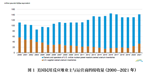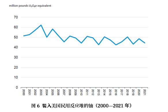 2021年美国装入民用反应堆的燃料组件中共含有4440万磅八氧化三铀当量,其中7%为国产铀,93%为进口铀。2020年的装填量为4860万磅。