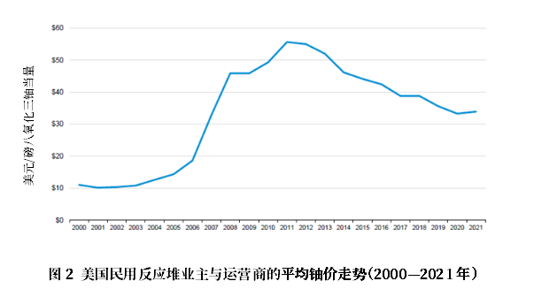 2021年,美国“民用核电厂业主和运营商”(COO)以每磅33.91美元的加权平均价格从美国和外国供应商处购买4674万磅八氧化三铀当量的铀,采购量比2020年(4893万磅)下降4%,价格比2020年(33.27美元)上升2%。