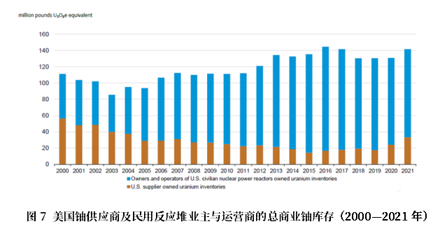 截至2021年12月31日,美国全部商业铀库存(包括美国供应商在国内外核燃料设施中拥有的处于各个核燃料循环阶段的铀库存)约为1.417亿磅八氧化三铀当量,较2020年(1.31亿磅)增加8%,其中COO拥有约1.085亿磅库存,同比增加2%,美国供应商共计拥有3316万磅库存,同比增长37%。
