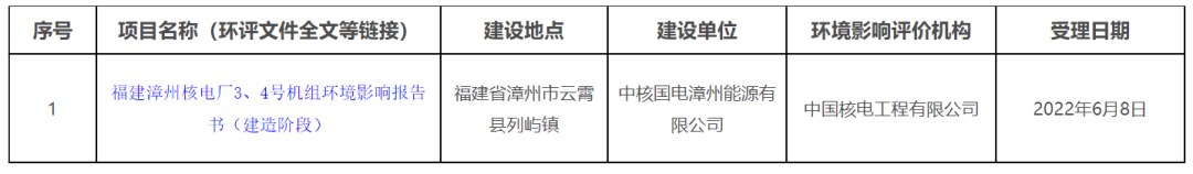 6月9日,生态环境部发布《关于2022年6月8日建设项目环境影响评价文件受理情况的公示(核与辐射)》,内容为福建漳州核电厂3、4号机组环境影响报告书(建造阶段)公示。