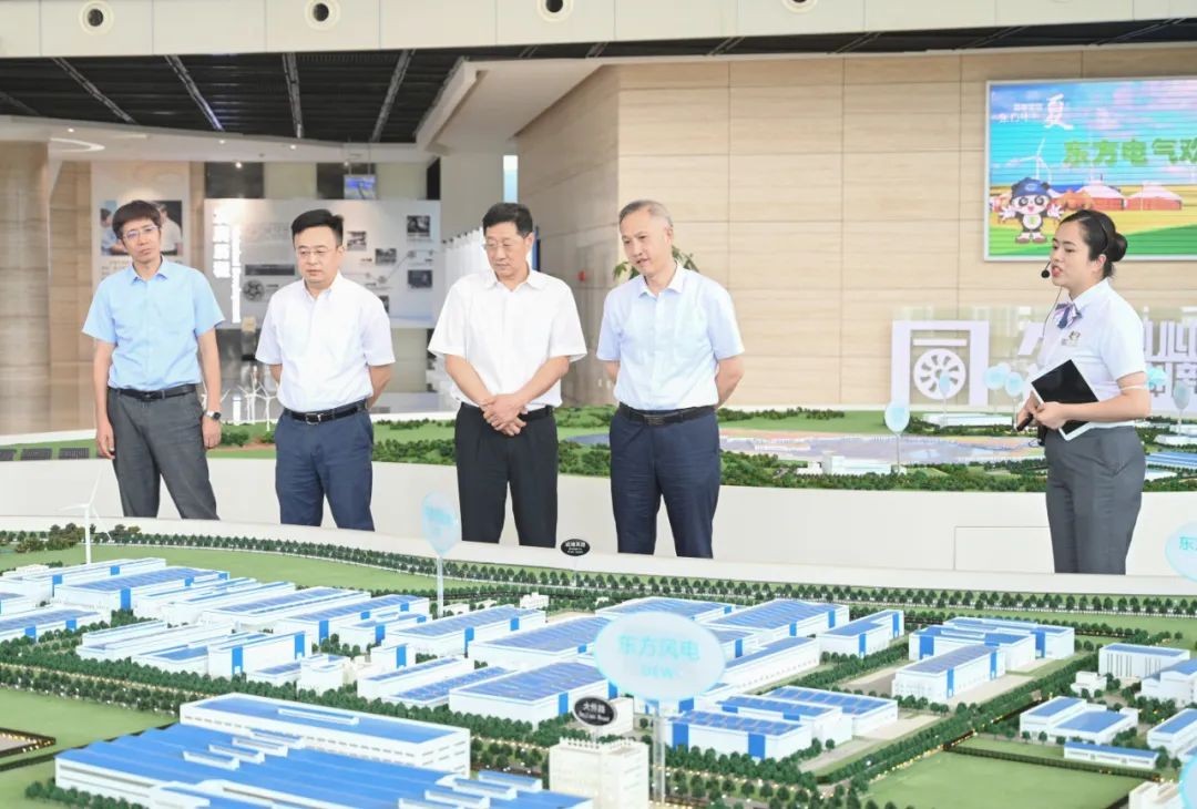 在东方电气副总裁高峰的陪同下,张必祥、刘叶一行参观了东方电气科技展示厅,深入了解东方电气的科技创新、装备制造、核能产业发展等情况。