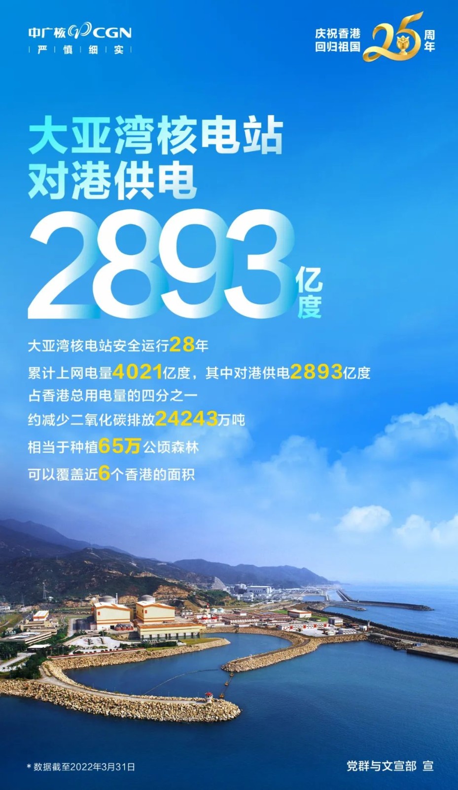 截至2022年3月31日,大亚湾核电站已持续对港供电28年,供电累计达2893亿度,28年来大亚湾核电站每年为香港供电超过100亿度,占香港总用电量的四分之一,为满足香港电力供应改善能源结构发挥了积极作用。