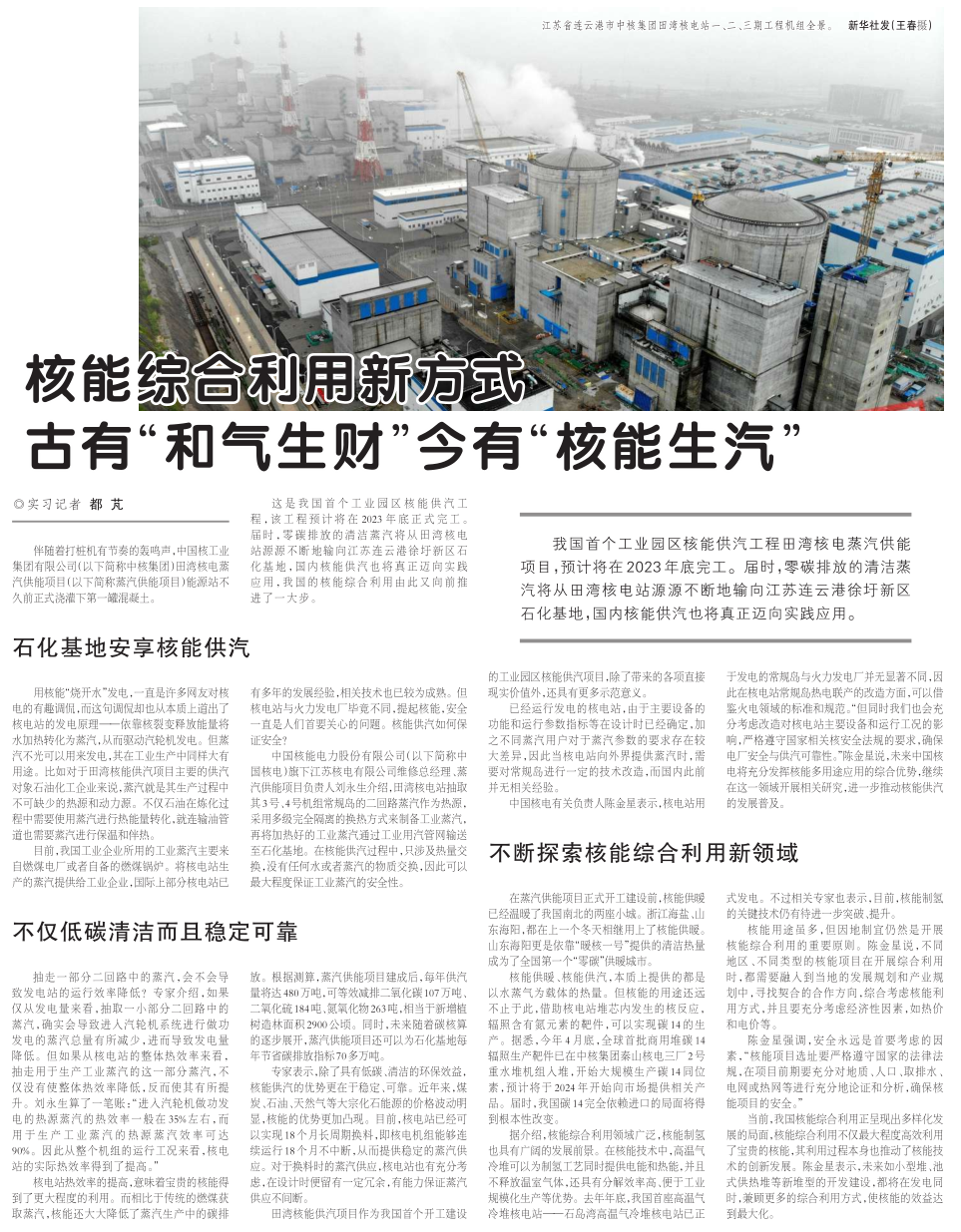 这是我国首个工业园区核能供汽工程,该工程预计将在2023年底正式完工。届时,零碳排放的清洁蒸汽将从田湾核电站源源不断地输向江苏连云港徐圩新区石化基地,国内核能供汽也将真正迈向实践应用 ,我国的核能综合利用由此又向前推进了一大步。