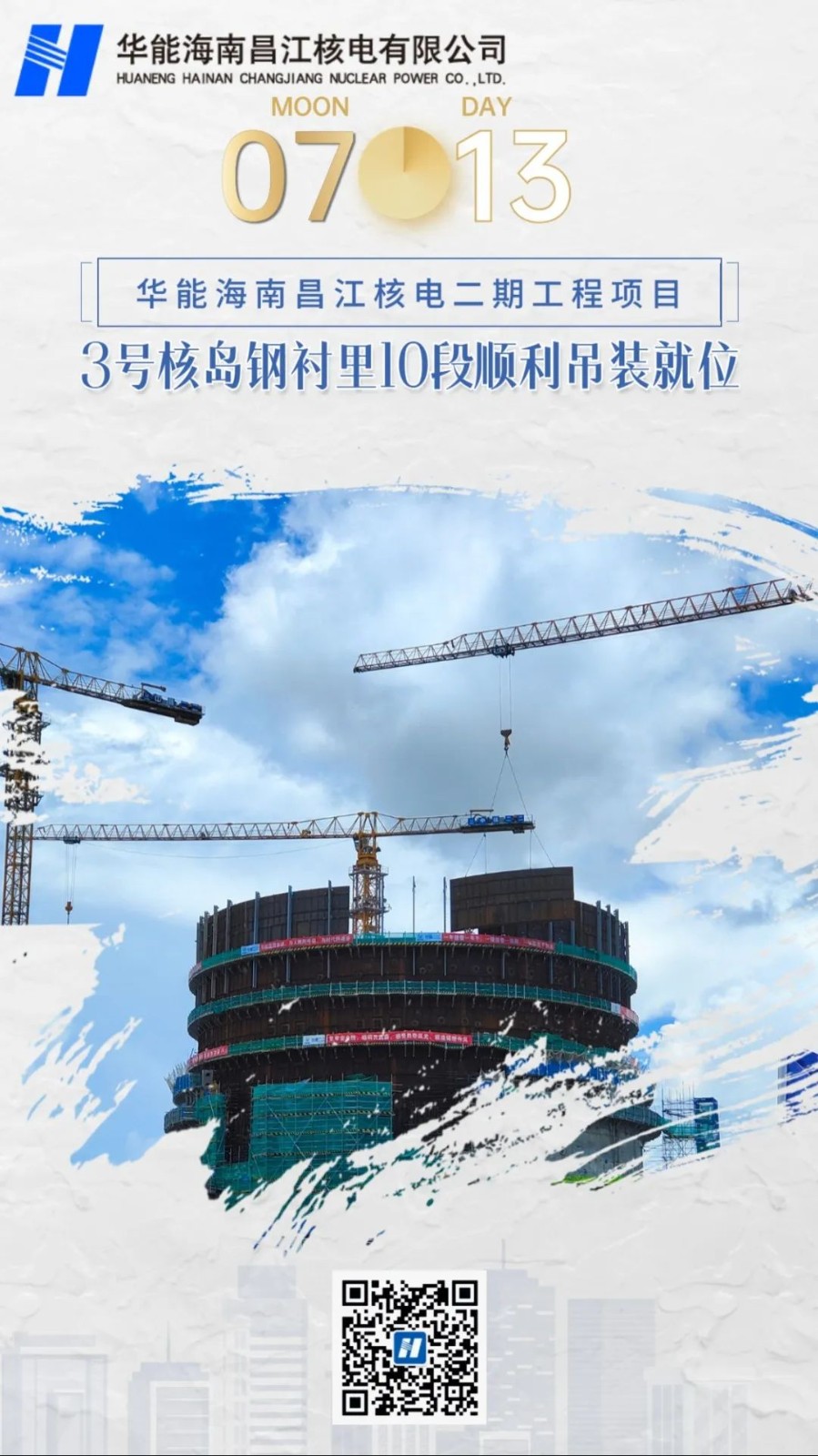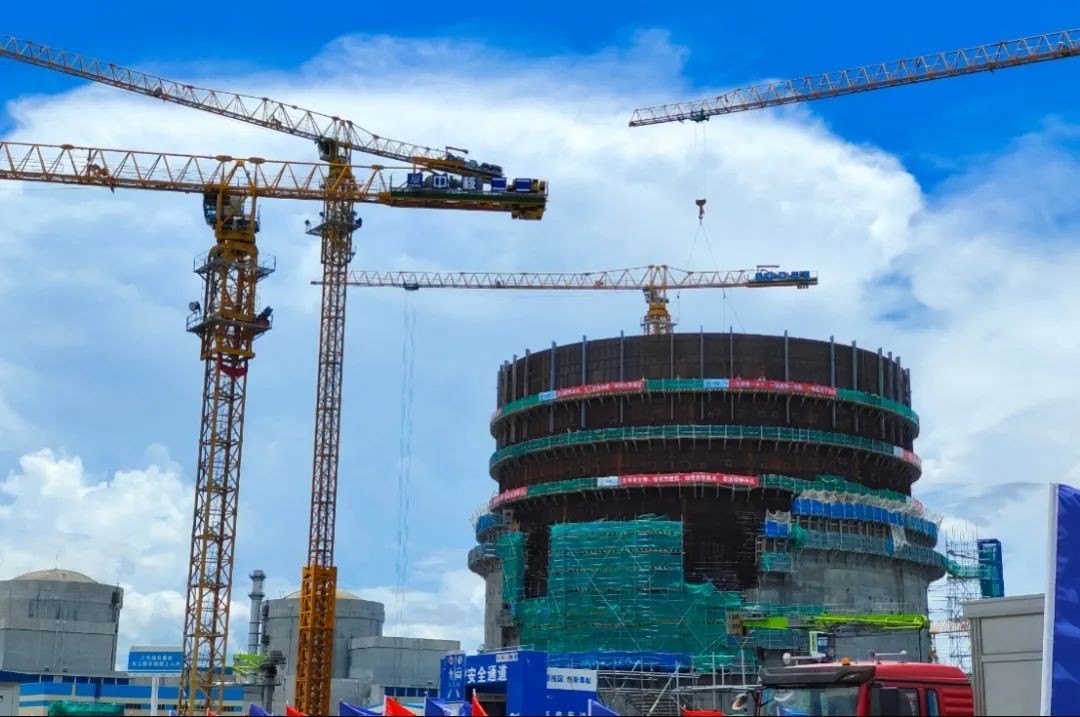 2022年7月13日12时55分,华能海南昌江核电二期工程3号核岛钢村里筒整10段钢衬里壁板全部吊装就位,又一重大里程碑顺利实现,较计划提前3天完成,标志着3号机组钢衬里筒壁全部安装就位,为后续环吊牛腿的安装提供了有利的条件。