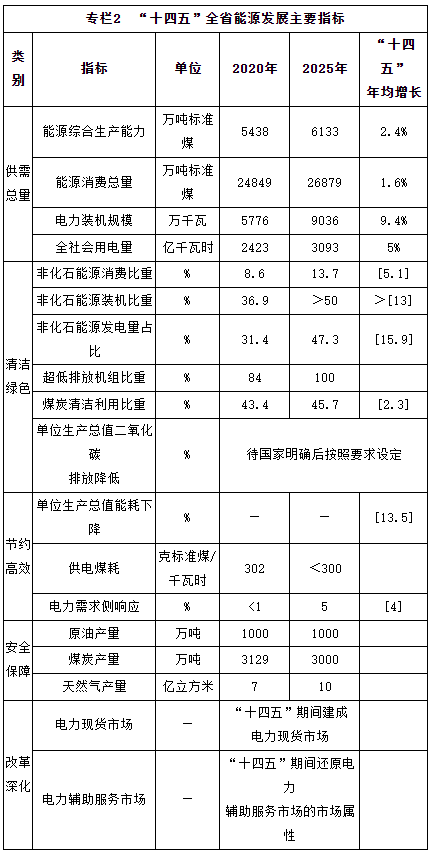 按照构建清洁低碳、安全高效的现代能源体系和着力建设清洁能源强省的目标要求,到“十四五”末全省能源发展主要目标是: