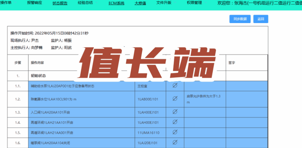 电子操作单支持在网络终端使用,操作数据能够实时回传至主控室,支持三方(值长、操纵员、现场)数据共享;对操作单中的不执行项或选择项,值长和操纵员可进行在线审批;仅需在线导出和提交两步,即可完成操作单的派发、使用、归档流程。
