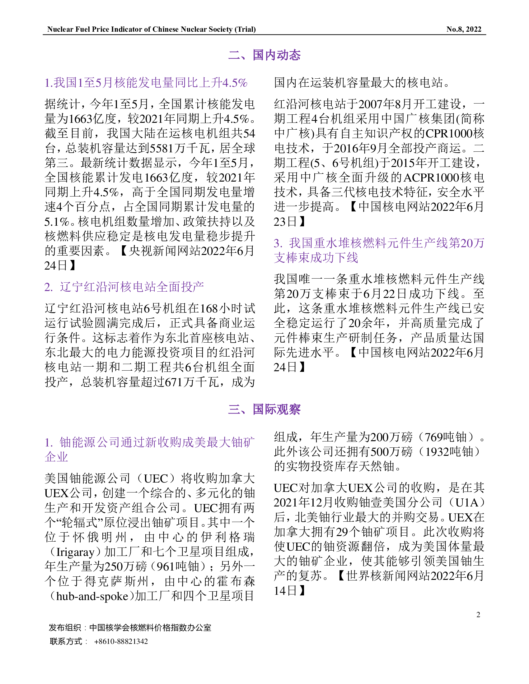 中国核学会核燃料价格指数(试运行)(2022年7月,总第8期)