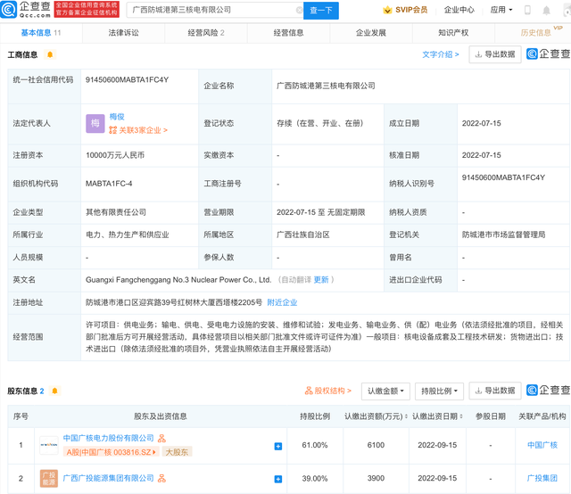 7月15日,广西防城港第三核电有限公司成立,法定代表人为梅俊,注册资本1亿元人民币,经营范围包含:核电设备成套及工程技术研发;货物进出口;技术进出口等。企查查股权穿透显示,该公司由中国广核(003816)、广西广投能源集团有限公司共同持股。