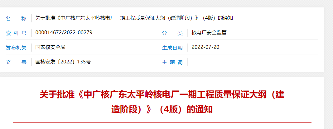 根据《中华人民共和国核安全法》《中华人民共和国民用核设施安全监督管理条例》的有关要求,我局对你公司提交的申请文件进行了技术审评,认为你公司《中广核广东太平岭核电厂一期工程质量保证大纲(建造阶段)》(4版)是可以接受的,现予批准。