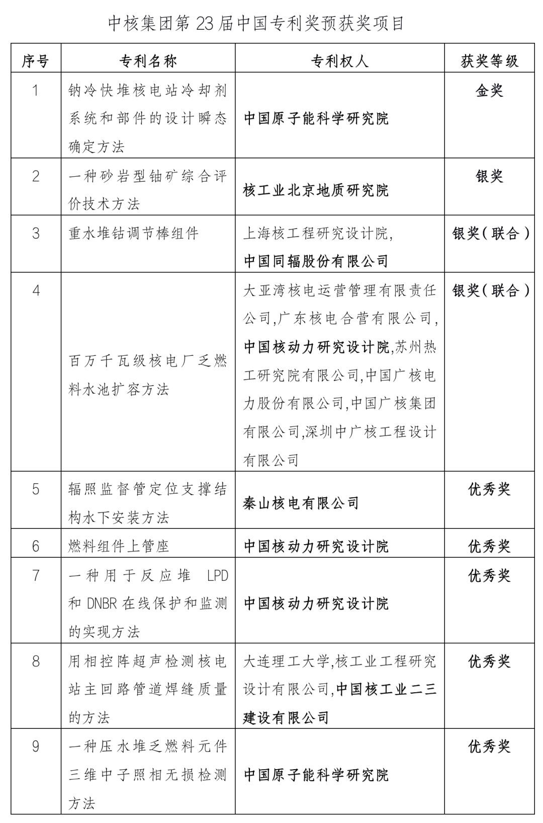 此次集团公司金榜题名,覆盖核电堆型设计、铀矿地质勘探、核燃料、反应堆控制、核电厂运行维护、核电工程建设、核技术应用等多个技术领域,反映了中核集团原创性引领性科技攻关的深厚积淀与重大突破,体现了集团公司长期以来知识产权工作的显著成效,更进一步提升了集团公司品牌与社会影响力。
