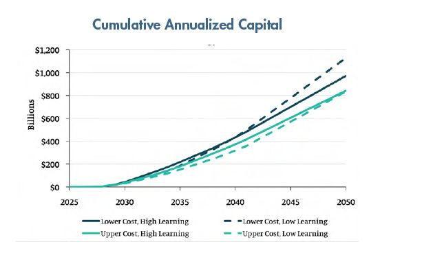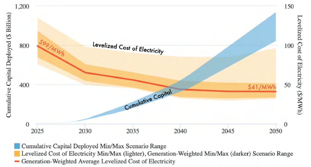 到2050年先进核能将成为美国电力结构的重要组成部分,因此先进核能的成本将在很大程度上影响全国零售电价。早期的资本投资和积累的建设经验能够使先进反应堆项目造价和先进核电技术的平准化度电成本大幅降低,从而促进新反应堆在全国范围内大规模部署。