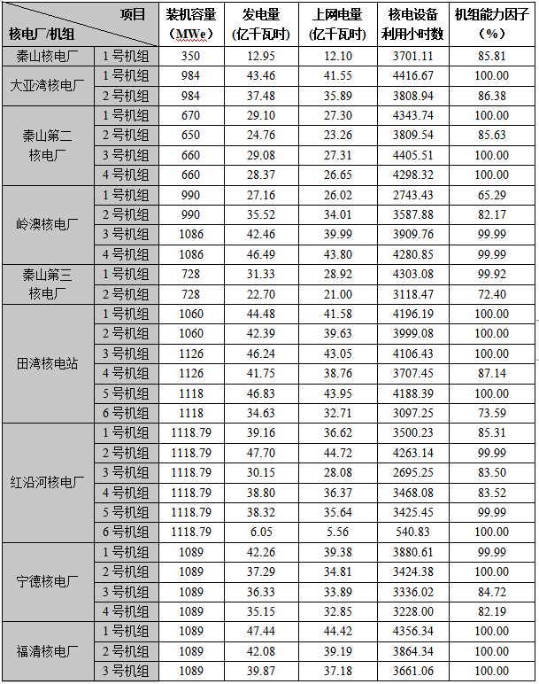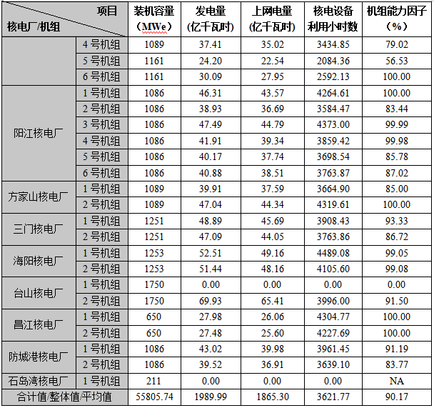 3) 本表“合计值/整体值/平均值”中,装机容量、发电量、上网电量为各机组合计值,核电设备利用小时数为全部机组整体值,机组能力因子为全部机组的算数平均值。