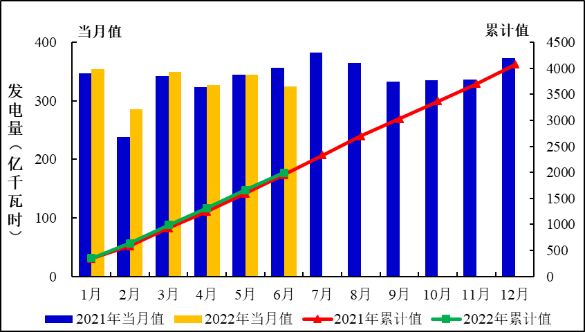 图2:2021年1月至2022年6月全国运行核电机组发电量趋势