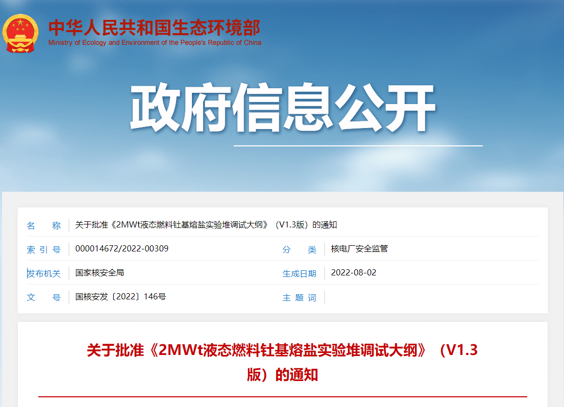 根据《中华人民共和国核安全法》《中华人民共和国民用核设施安全监督管理条例》的有关规定,我局对你所提交的申请文件进行了技术审评,认为你所《2MWt液态燃料钍基熔盐实验堆调试大纲》(V1.3版)是可以接受的,现予批准。