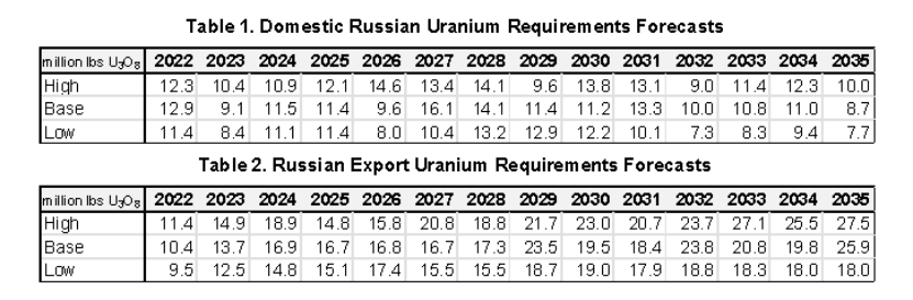 在表1中俄罗斯国内天然铀需求的三个情景中,需求量逐渐减少。中情景中,国内需求量预计从当前的1290万磅U3O8(4962吨铀)的降至到2035年的870万磅U3O8(3346吨铀)。另一方面,中情景下俄罗斯出口核电机组的天然铀需求预计从2022年的1040万磅U3O8(4000吨铀)增加至2035年的2590万磅U3O8(9962吨铀),出口国家包括:埃及、白俄罗斯、保加利亚、匈牙利、斯洛伐克和乌克兰。尽管乌克兰所有的核电机组均为俄罗斯设计,但未来乌克兰核燃料的来源仍具有不确定性。近几年,乌克兰与美国西屋公司(Westinghouse)签订了燃料组件制造协议,计划未来从非俄企业采购天然铀以摆脱俄罗斯垄断。乌克兰国内也生产一些天然铀,能满足一部分天然铀需求。