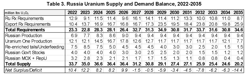 表3的需求考虑了俄罗斯国内需求和出口核电捆绑需求,供应端考虑了所有已知的供应来源,包括国内矿山产量、在哈项目权益产量、短料加工、尾料再富集、俄罗斯政府库存释放、MOX燃料中的铀。