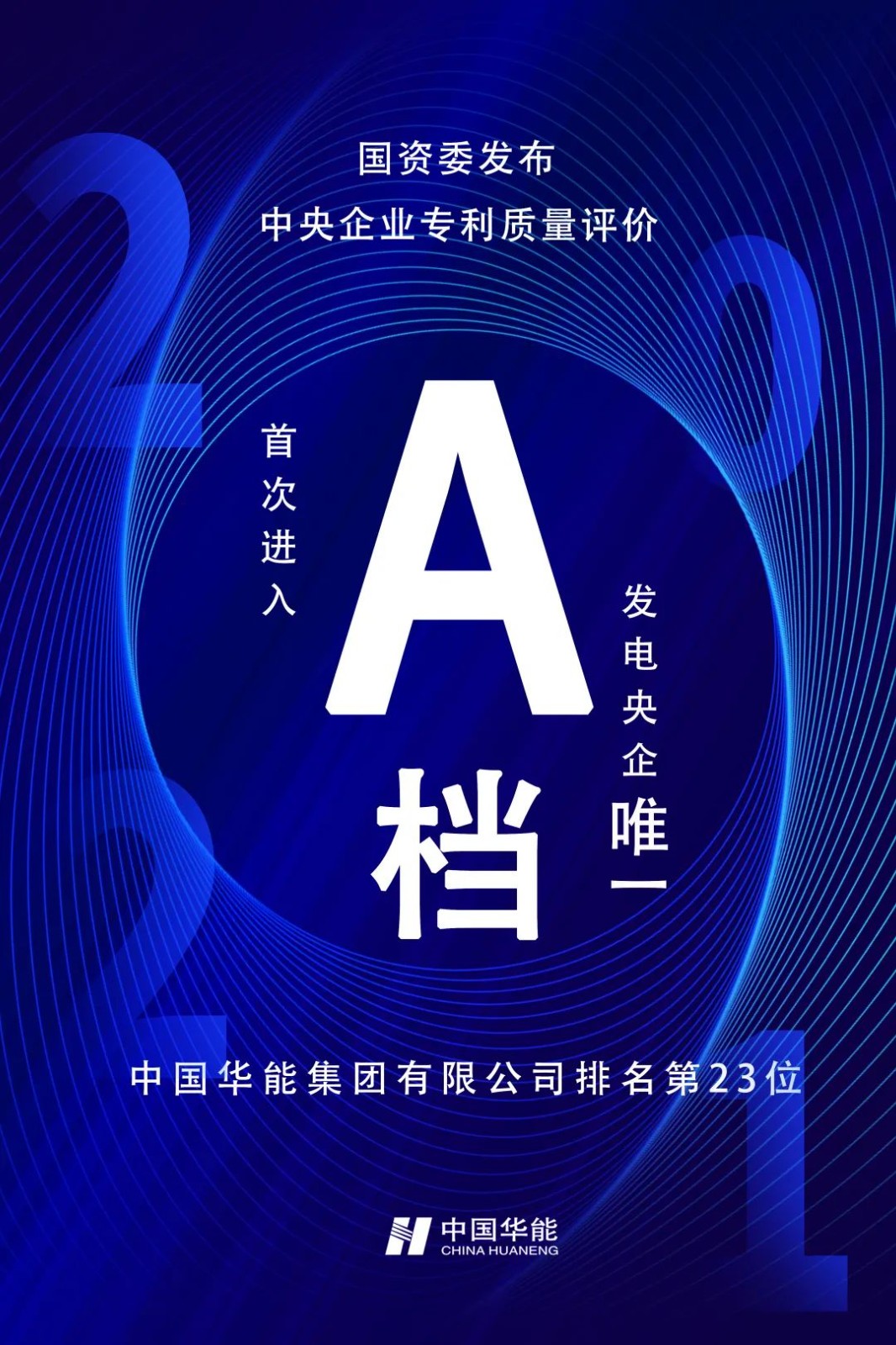 国资委发布2021年度中央企业专利质量评价结果,中国华能集团有限公司排名第23位,首次进入A档,是发电行业央企中唯一进入A档的企业。