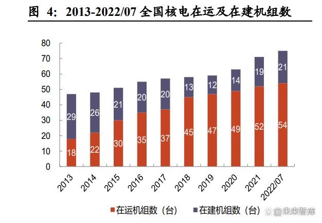 核电站运营管理呈现寡头垄断格局。2021 年 3 月,国家核安全局为华能集团海南昌 江核电项目 3、4 号机组颁发《核设施建造许可证》后,目前我国核电运营领域已有 中国广核、中国核电、国家电力和华能集团 4 家企业获得资质。由于核电领域技术 要求高,建设周期长,行业壁垒高,整个市场呈现中国广核、中国核电平分天下, 国家电力、华能集团开始兴起的格局。2021 年,中广核集团核电发电量为 2135 亿 千瓦时,占全国核电发电量比重最大。截至 2022 年上半年,中广核集团、中核集团、 国家电投、华能集团的核电在运机组装机容量占比分别为 53%、41%、4%、0.4%; 在建机组装机容量占比占比分别为 30%、42%、17%、11%。