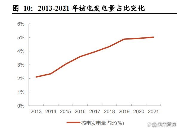 核电渗透率仍存在提升空间。我国核电发电量占总发电量的比重由 2013 年的 2.1% 升至 2021 年的 5.0%,虽然呈现逐年增加的趋势,但占比仍低于火电、水电、风电 的占比,且显著低于许多发达国家和发展中国家的水平,核电行业的渗透率有望进 一步提升。