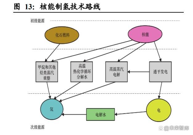 随着“双碳”战略的推进和核能技术的不断发展,“核电+”将成为一种核能应用的新发展模式。核能将不仅仅扮演提供电力的角色,在核能制氢、区域供热、海水淡化等多种非电综合利用领域都将发挥功能,这些领域将成为核能行业的新蓝海。 核能制氢技术成熟,综合优势明显。核能制氢主要有传统电解水制氢、高温蒸汽电 解制氢和高温热化学循环工艺制氢 3 类。电解水制氢的效率仅有 30%左右,并不适用于规模化制氢。高温热化学循环制氢和高温蒸汽电解制氢比普通电解耗能更少、 效率更高,需要用到高温气冷堆。而高温气冷堆目前在我国已有较好的研发基础, 适合大规模制氢。相较于其他新能源制氢方式,核能高温气冷堆制氢的成本是 20 元 /kg,处于较低水平;相较于传统化石能源制氢方式,核能高温气冷堆制氢的成本虽然略高,但碳排放强度在 1 kgCO2/kgH 以下,低于化石能源制氢的碳排放强度 10kgCO2/kgH。综合来看,核能制氢优势明显。