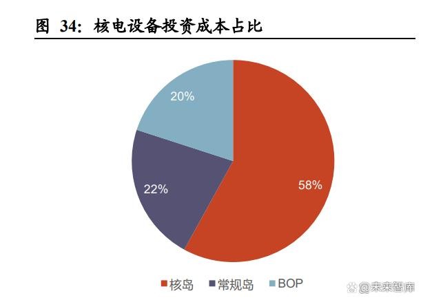 核电设备包括核岛、常规岛及辅助设备。核岛是整个核电站的核心,负责将核能转化为热能,是核电站所有设备中工艺最复杂、投入成本最高的部分,投资成本占比 达 51%。核岛设备中,反应堆压力容器、主管道及热交换器和蒸汽发生器是核岛设备中的主要关键设备,因而投资占比也最高。常规岛利用蒸汽推动汽轮机从而带动 发动机发电,主要包括汽轮机、发电机和汽水分离再热器等设备。辅助系统(BOP) 主要包括数字化控制系统、暖通系统,保障核电站平稳运行,工程规模最小。