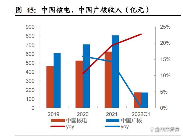中国核电、中国广核收入利润持续增长。由于核电运营商的收入主要来自于电力销 售,而我国核电机组遵循“多发、满发”原则,具有较高的年均利用小时数,在运 机组的收入较为稳定,在建机组每年都保持一定数量的增加,因此中国核电、中国 广核的收入利润能够持续增长。2022Q1,中国核电的营业总收入为 171 亿元,同比 +23%,归母净利润为 29 亿元,同比+53%;中国广核的营业总收入为 172 亿元,同比+0.2%,归母净利润为 29 亿元,同比+20%。