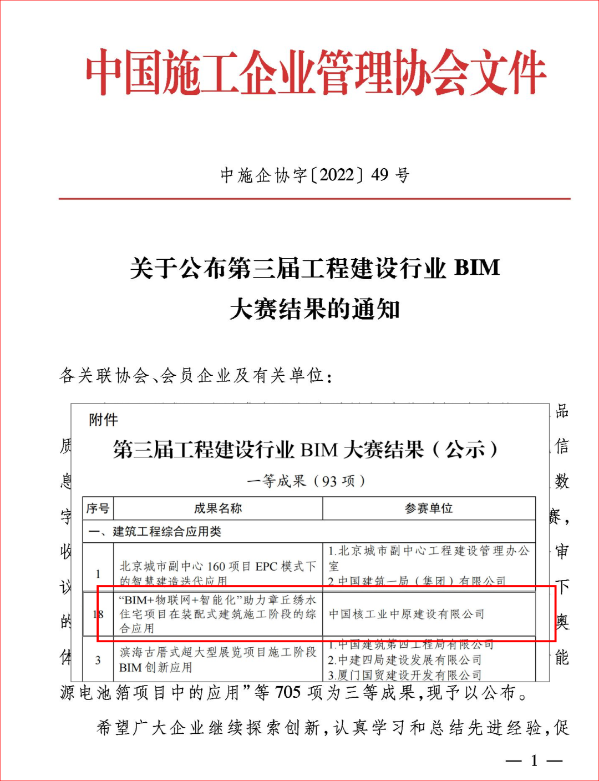 近日,中国施工企业管理协会“第三届工程建设行业BIM大赛”公布获奖名单,中核中原建设《“BIM+物联网+智能化”助力章丘绣水住宅项目在装配式建筑施工阶段的综合应用》获建筑综合应用类一等奖,为集团公司在该组别获得的最高荣誉。