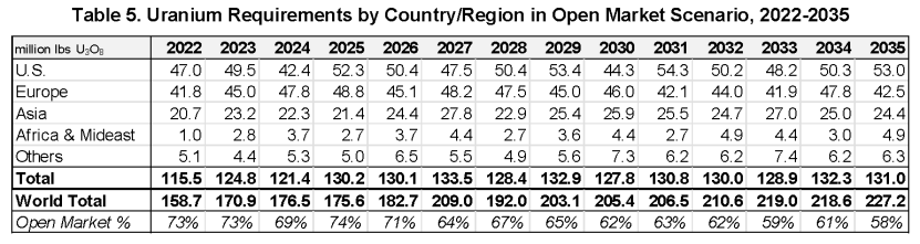上表中的国家占2022年全球铀市场总需求的约73%。不过随着中国、俄罗斯以及依赖中、俄设计的核电机组的国家持续发展核电,且一些公开市场的国家核电装机逐渐减少,预计到2030年左右,公开市场的铀需求占全球份额将下降至62%,到2035年将进一步下降至58%(见下表)。