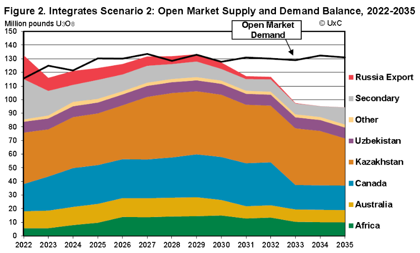 如下图中的情景1所示。本方案假设2023年起由于美国政府的潜在禁令,美国开始停止进口俄罗斯铀。本方案中的绝大部分国家继续执行现有合同进口俄罗斯铀。即使2023年美国停止进口俄罗斯铀,本情景显示对公开市场影响很小,2023年的潜在供应缺口为5100千磅U3O8(1962吨铀),2025年为1700千磅U3O8(654吨铀)。2026年到2030年,该表显示公开市场预计存在供应过剩。2031年至2035年,由于现有的进口俄罗斯铀的合同逐渐减少且天然铀产量由于项目退役而下降,供需缺口逐渐增长。