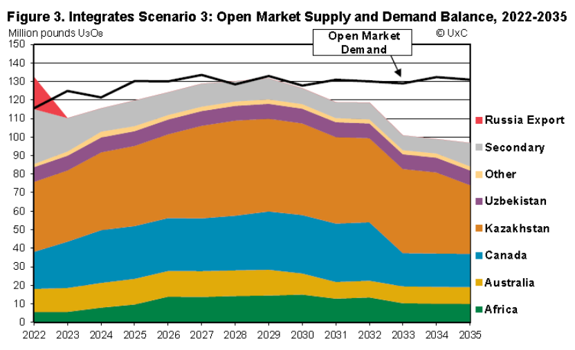 情景3采用了最极端的方法来确定公开市场的缺口,假设所有国家均选择禁止从俄罗斯进口铀。该情景假设:
