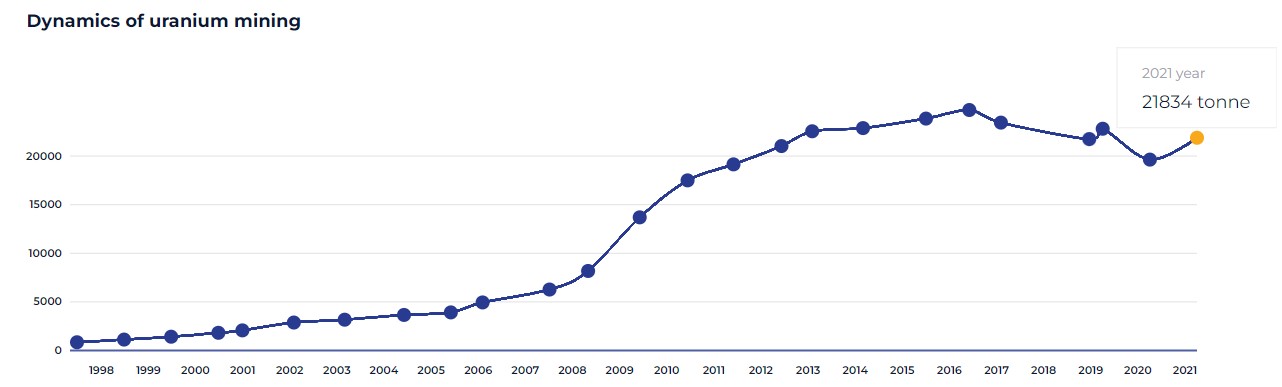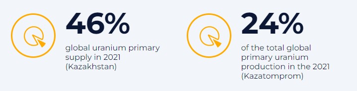 哈萨克斯坦是世界上最大的铀生产国,2021年时其产量占全球铀供应量的46%。同一年,Kazatomprom公司占全球铀总产量的24%,位列第一。