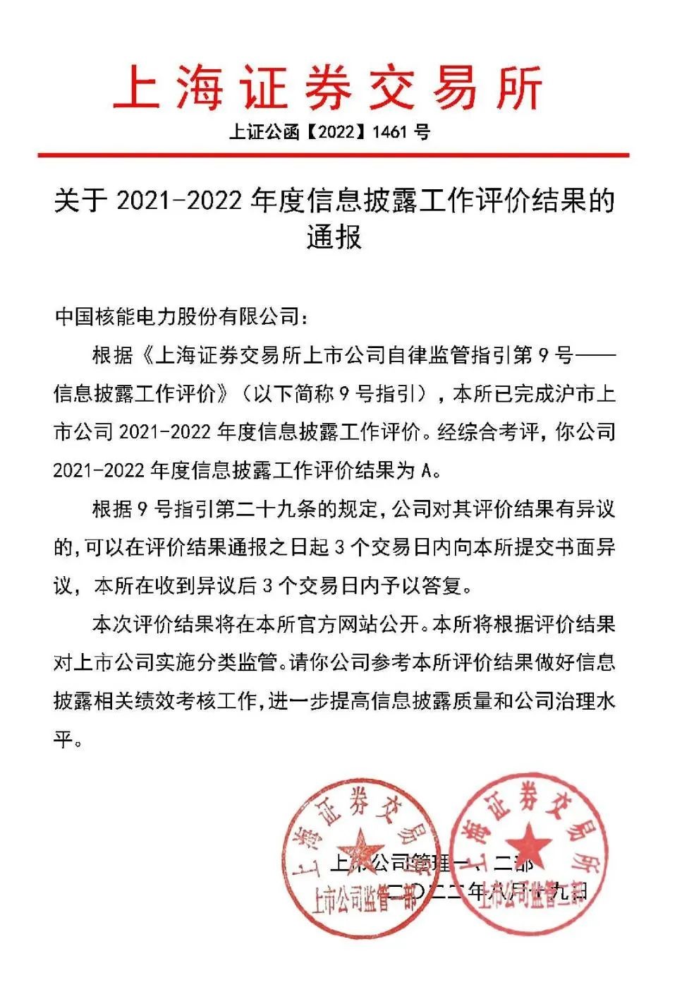 近日,上海证券交易所公布了沪市上市公司2021至2022年度信息披露工作评价结果,中国核电(601985)再次获得最高等级A级评价(优秀),这也是公司自2015年上市以来第六次荣获信息披露A级评价,充分彰显了上交所对公司在治理运作规范、信息披露质量、投资者关系维护等方面的高度肯定。