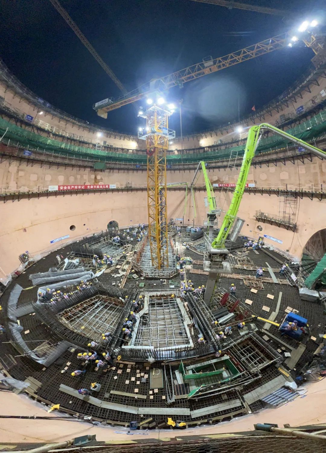 8月28日,入夜,1BRX内部结构+17.50m平台板上灯火通明,这里是与时间赛跑,同进度比拼的施工前沿阵地。建设者们蓝衣执甲,严阵以待。傍晚夜幕降临时,3台布料机陆续就位,张开29米长的臂架,盘旋在内部结构上空。20时08分,随着对讲机里“指挥长”仲亚林一声令下,1410方大体积混凝土的浇筑作业在紧张有序中拉开了帷幕。