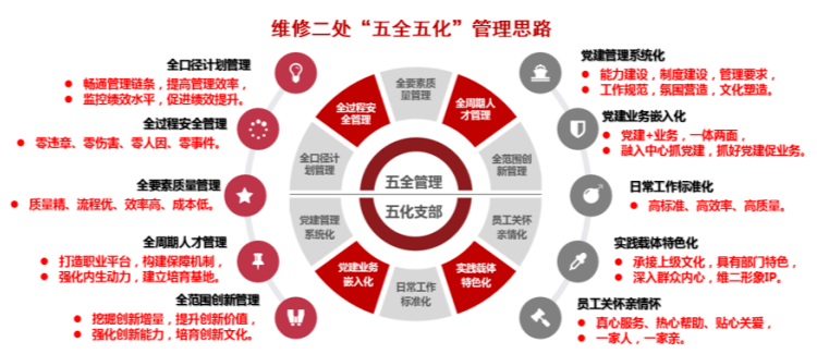 加强顶层设计,探索基层党建工作新思路。导入卓越绩效管理模式,基于霍尔三维结构模型,提出“五全五化”管理思路,以精细化管理为抓手,搭建高质量职业平台、培养高素质维修人才、打造高绩效专业团队,坚持党政一体、模块主战、专业主建,抓好“党建+业务”十大模块。着力“融入中心有力、提升管理有招、服务群众有心”,确立当年党建工作思路,全面深化基层党建管理创新。