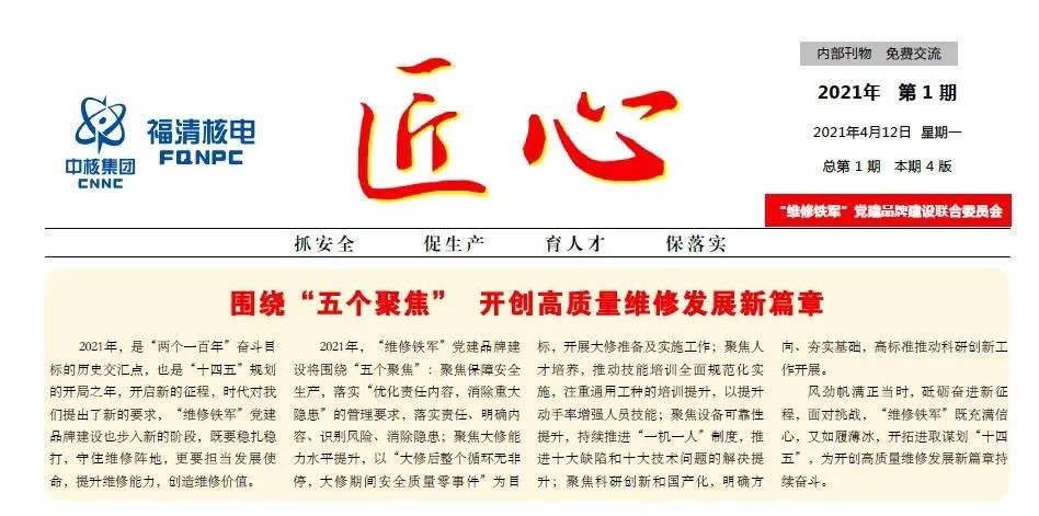 深化党建联建,助力“华龙一号”平稳推进。聚焦华龙示范工程,建立“维修铁军”党建联建,并构建厂间快速协同机制,选派集团首席技师等党员骨干入驻华龙维修专家团,助力示范工程商运与首循环首大修安全完成。发挥华龙品牌效应,依托成员单位间人才调配协议,有组织、按体系、成建制对外输送两批次技术骨干,助力华龙批量化建设与重大工程调试攻坚。立足示范工程先发优势,选派多名领域优秀人才支援海外华龙大修。